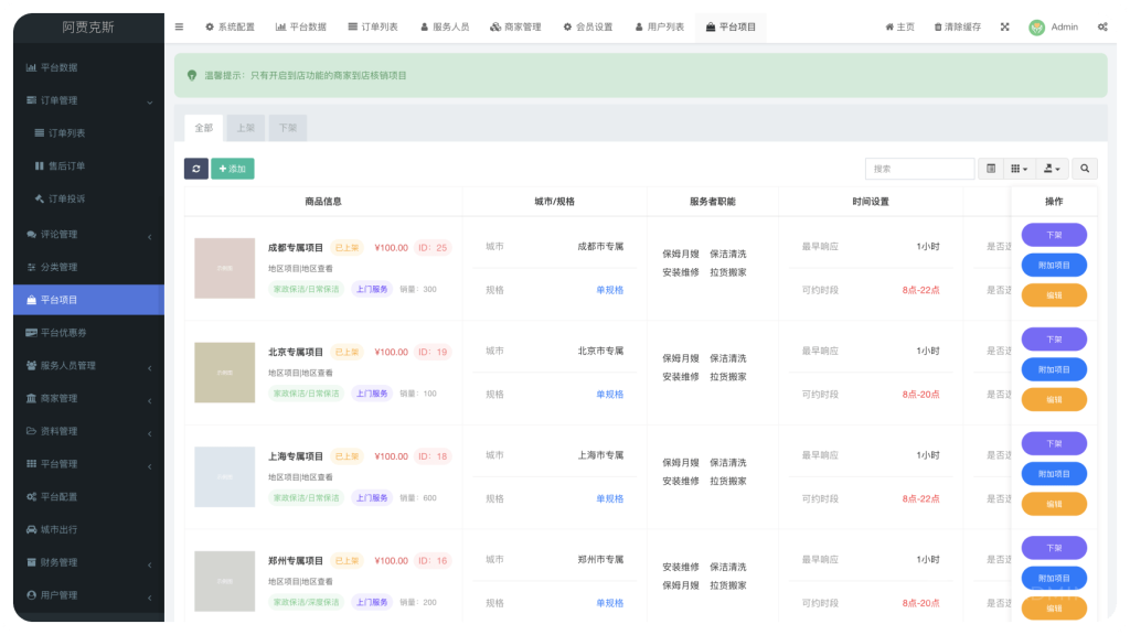 原生微信小程序开发的一款同城预约、上门服务、到店核销家政系统,用户端、服务端、门店端各端相互依赖又相互独立,支持选择项目、选择服务人员、选择门店多种下单方式,支持上门服务和到店核销两种服务方式,支持自营和多商家联营两种运营模式,同时支持多城市并且设置每个城市专属服务项目。